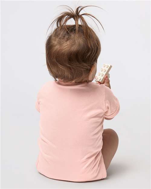 The Rabbit Skins Infant Fine Jersey Bodysuit is made from 100% combed ring-spun cotton for a soft, comfortable feel. Available in sizes Newborn to 24M, it offers a great fit for your little one. The bodysuit features flatlock-stitched seams and a double-needle stitched ribbed binding on the lap shoulder neck, shoulders, sleeves, and leg openings for added durability.